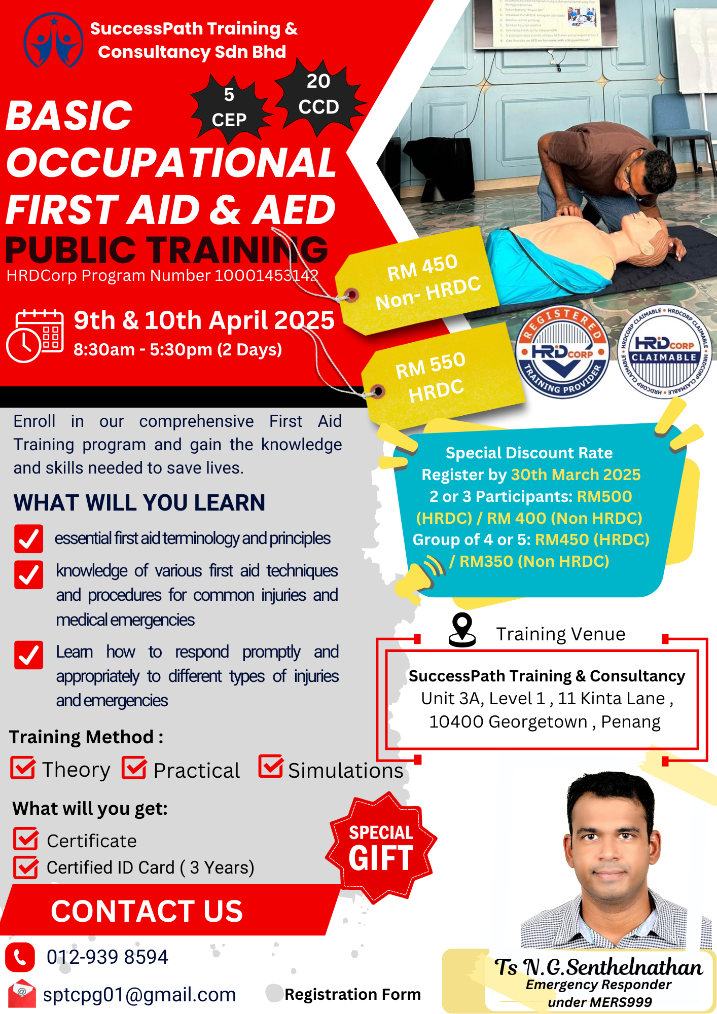 This First Aid training is to train participants on first aid procedures during a medical emergency at work place. The participants will be trained to use AED and hands on CPR and chocking techniques. Besides that participants will also be taught to do bandaging, burnt injury and snake bite management. This training is part of fulfilment the requirement of Health and Safety Act 1994