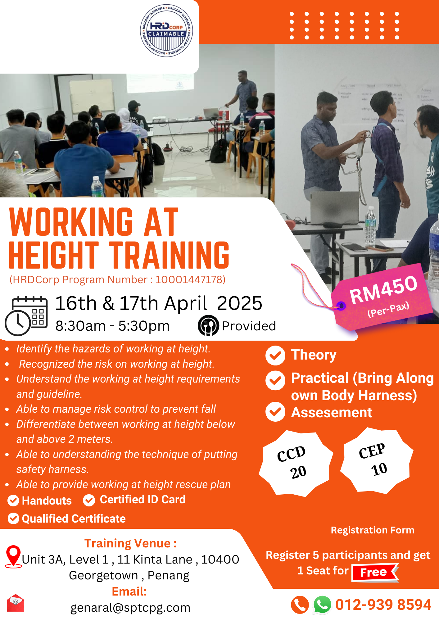 Participants will be able to work safely at heights in the workplace with minimal supervision by identifying the requirements of the job, accessing and installing the required equipment, and cleaning up the work area. They will also be able to conduct a risk assessment of the job.